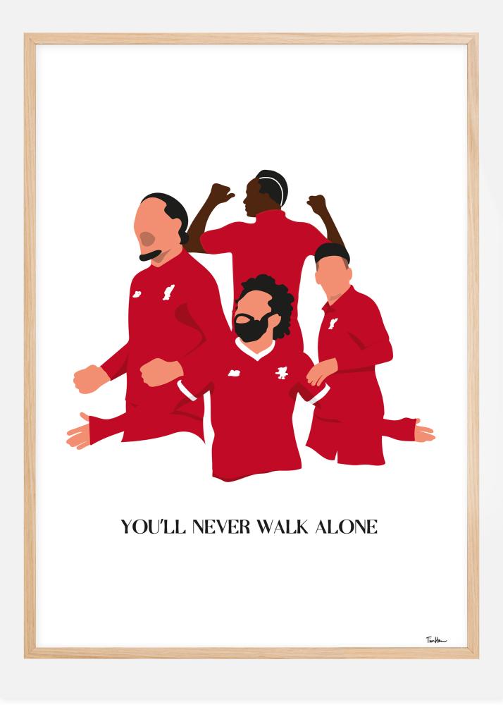 En fotbollsposter med fyra Liverpoolspelare i stiliserad form i sina röda tröjor. Under spelarna står orden You'll Never Walk Alone, klubbens motto men också ett viktigt citat i livet som är perfekt för att få dig motiverad varje morgon.