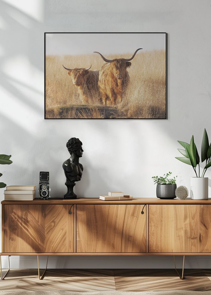 Denna poster fångar en lugn och naturlig scen med två höglandskor som står stolt i ett fält av torra gräs. Motivet utstrålar en rustik charm och en känsla av frihet i det öppna landskapet. Detta print erbjuder en känsla av det skotska höglandet och är perfekt för att förvandla vilket rum som helst med sin naturnära estetik.