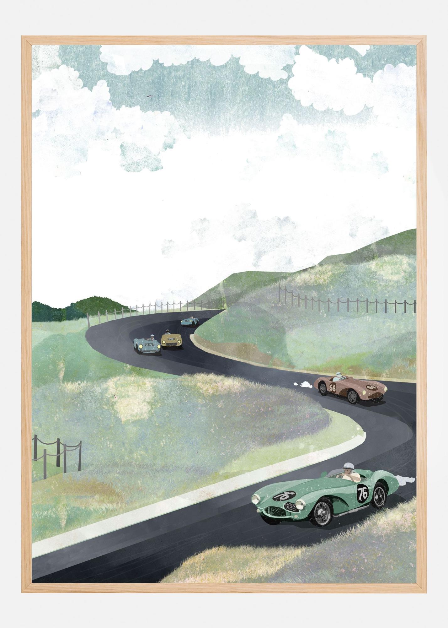 Denna stilfulla och nostalgiska affisch fångar essensen av klassiska biltävlingar med sin charmiga illustration av vintage-racerbilar på en slingrande landsväg. De lugna, men samtidigt livfulla scenerierna av fordon i rörelse erbjuder en känsla av rörelse och tidsenlig elegans, vilket gör denna print idealisk för bilentusiaster och älskare av retroinredning. De mjuka gröna nyanserna av naturen och den gråblå himlen ger en harmonisk och avslappnande känsla, vilket bidrar till ett sofistikerat och tidsöverskridande uttryck i en posterform.
