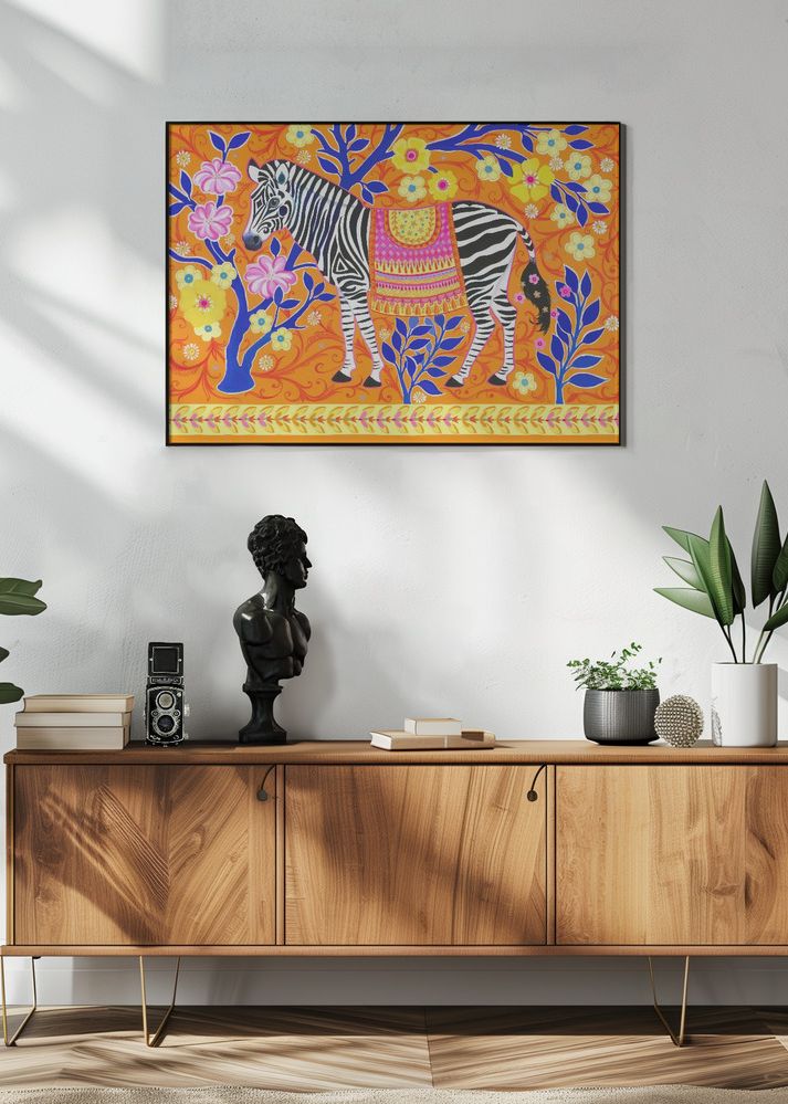 Upplev en explosion av färg och energi med denna livfulla affisch som presenterar en illustrerad zebra omgiven av frodig flora. Motivet osar av en distinkt och samtida känsla och är perfekt för den som vill införa en kreativ och konstnärlig vibb i sitt hem eller kontor. Posterens vibrerande färgpalett dominerar i nyanser av orange, gul, rosa och lila, vilket får den zebramönstrade figuren i svart och vitt att verkligen sticka ut.