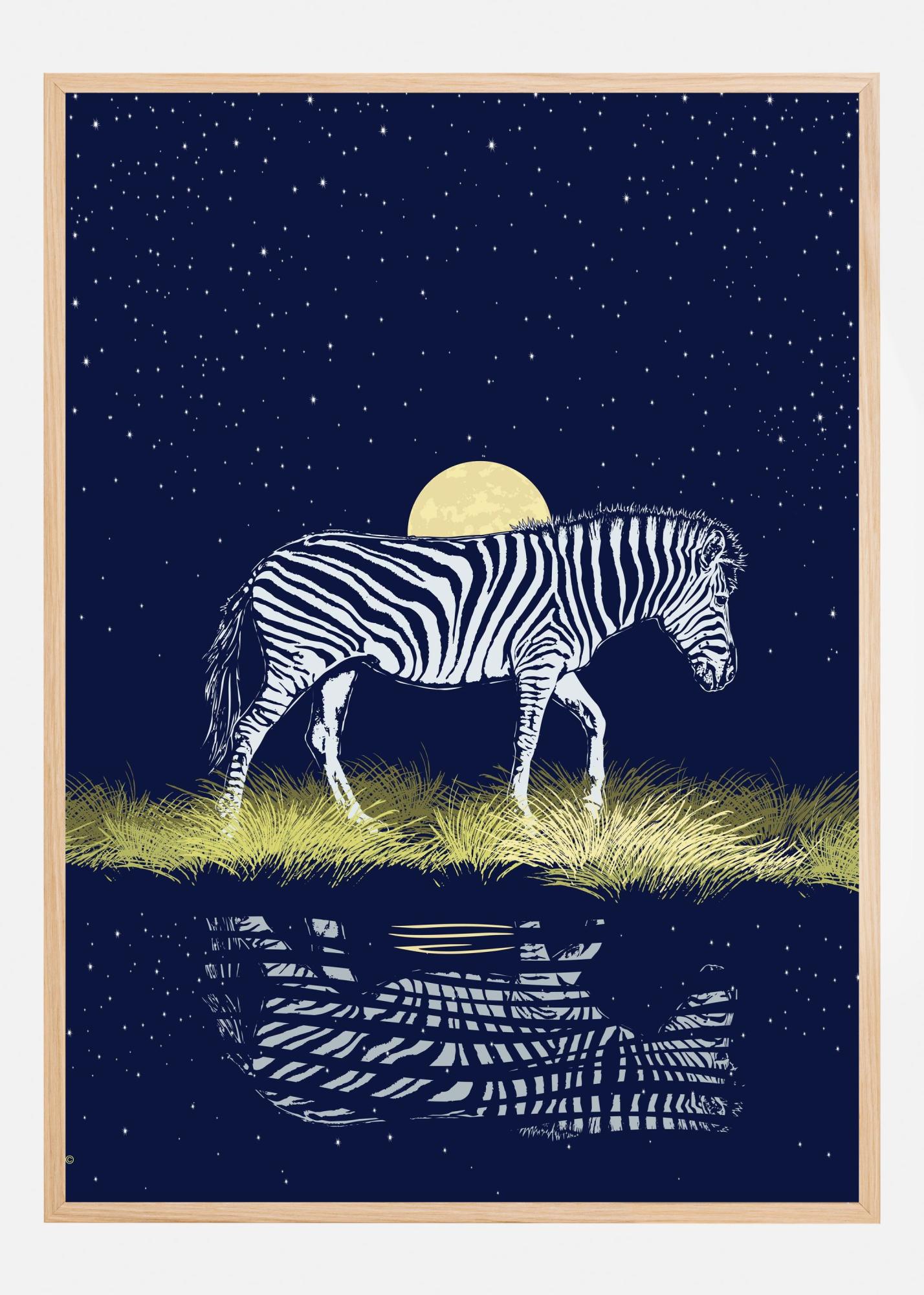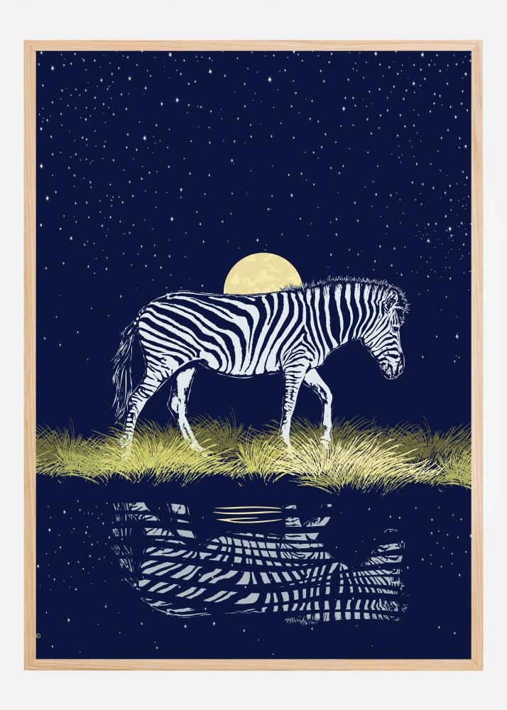 Med en elegant kontrast mellan den djärva silhuetten av zebrafärgerna och det gyllene skenet från månen, erbjuder denna poster en unik kombination av färg och form. Små detaljer såsom de lysande stjärnorna i den mörkblå himmelen och zebrens levande spegelbild i vattenytan gör att denna bild inte bara är en dekoration, utan ett konstverk som väcker uppmärksamhet. De ingående färgerna som definierar detta verk är djupt blått, varmgult och inslag av grönt i gräset, vilket kompletterar varandra och kommer att berika varje rum med en modern och trendig känsla.
