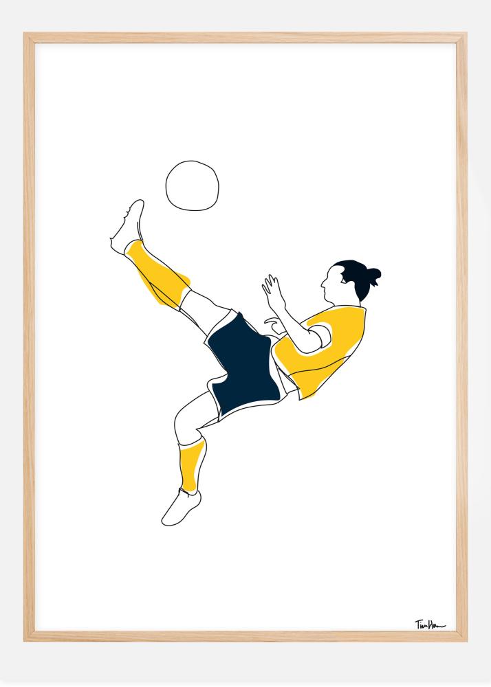 En fotbollsposter med en stiliserad bild av Zlatan Ibrahimovic som sparkar en fotboll. Spelaren bär en gul topp och strumpor med marinblå shorts. Han lutar sig bakåt och sparkar med benet högt upp i luften där fotbollen kommer seglande. Fira din kärlek till fotbollen med denna enkla men effektiva design.