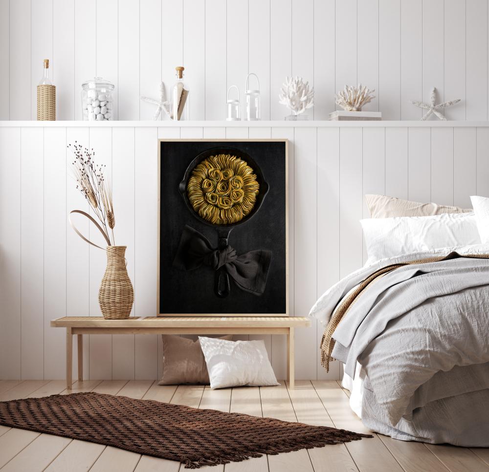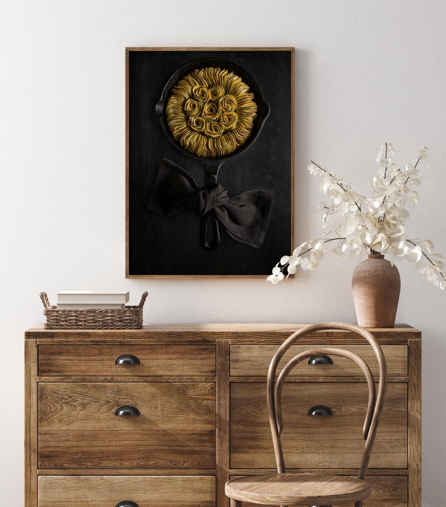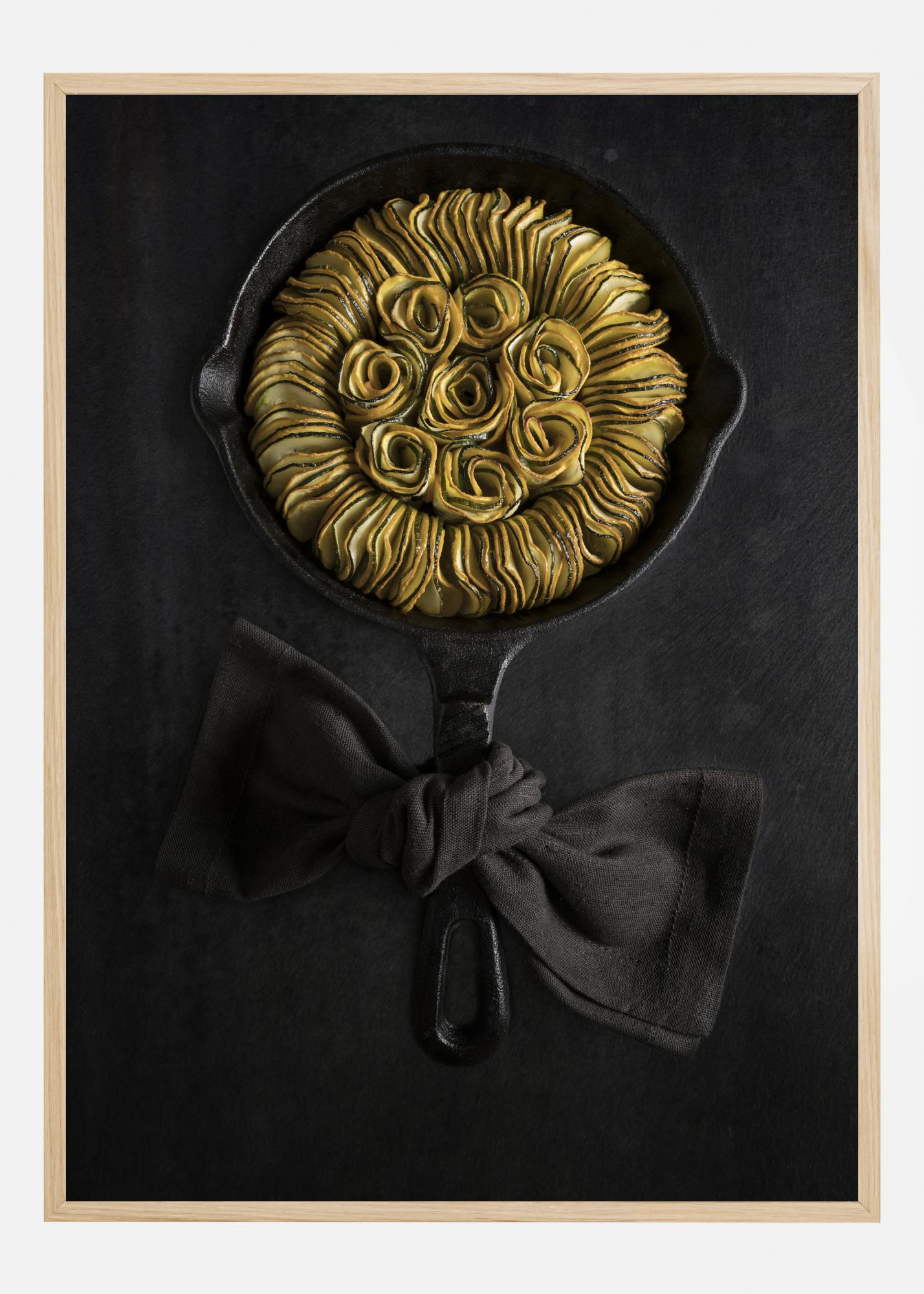 En läcker poster med en ratatouille med zucchini eller squash som elegant arrangerats i en gjutjärnspanna och skapar en fantastisk solrosform. De gula och gröna zucchinerna sticker ut mot den svarta stekpannan med en tygbåge knuten om handtaget. Häng upp den här i ditt kök och se om du kan göra denna lockande rätt.